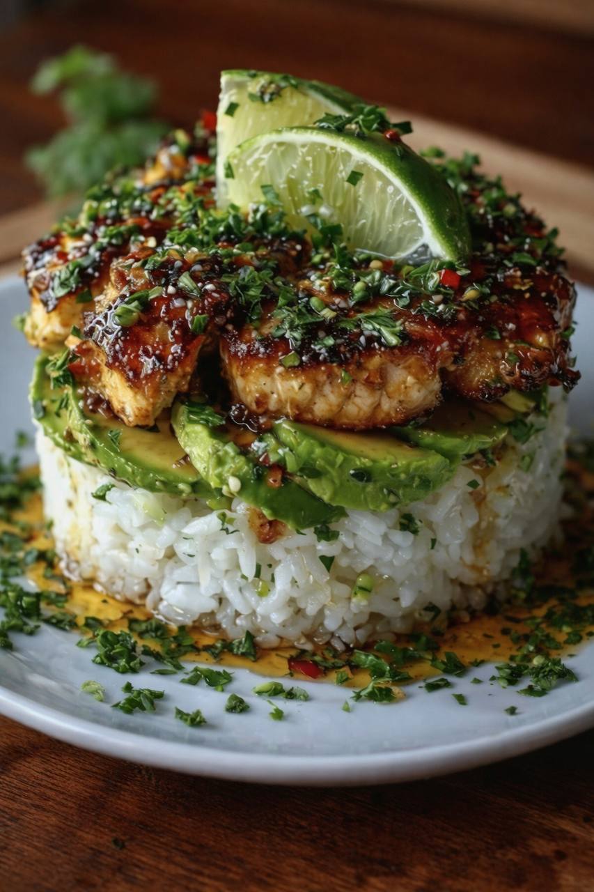 The appeal of this Honey Lime Chicken and Avocado Rice Stack lies in its brilliant balance. Each component plays a crucial role: the chicken, marinated and glazed to perfection, offers a tender, juicy protein punch; the rice provides a comforting, neutral base; and the avocado layer introduces a rich, buttery contrast. The fresh burst of lime and the delicate sweetness of honey tie everything together, creating a flavor profile that’s both refreshing and deeply satisfying. This dish is perfect for those who appreciate a meal that’s not only delicious but also visually stunning, making it ideal for a special occasion or simply to brighten up an ordinary evening.